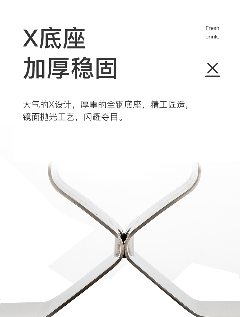 厚重的X形全钢底座,采用镜面抛光工艺,既稳固又美观,为果汁鼎提供更强的支撑力。底座抗压耐用,即使在高流量使用环境中也能保持稳固。