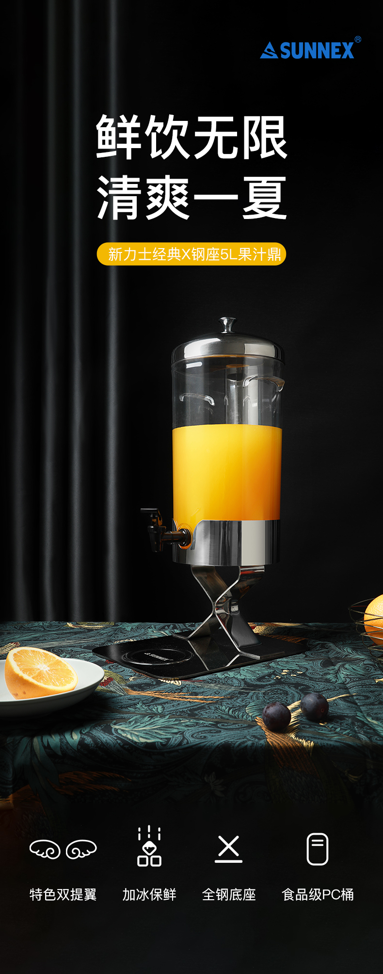 X钢座果汁鼎以其典雅简洁的外观和大气的全钢底座,完美融入自助餐和宴会场景,提升餐饮档次,成为饮品区的闪耀亮点。
