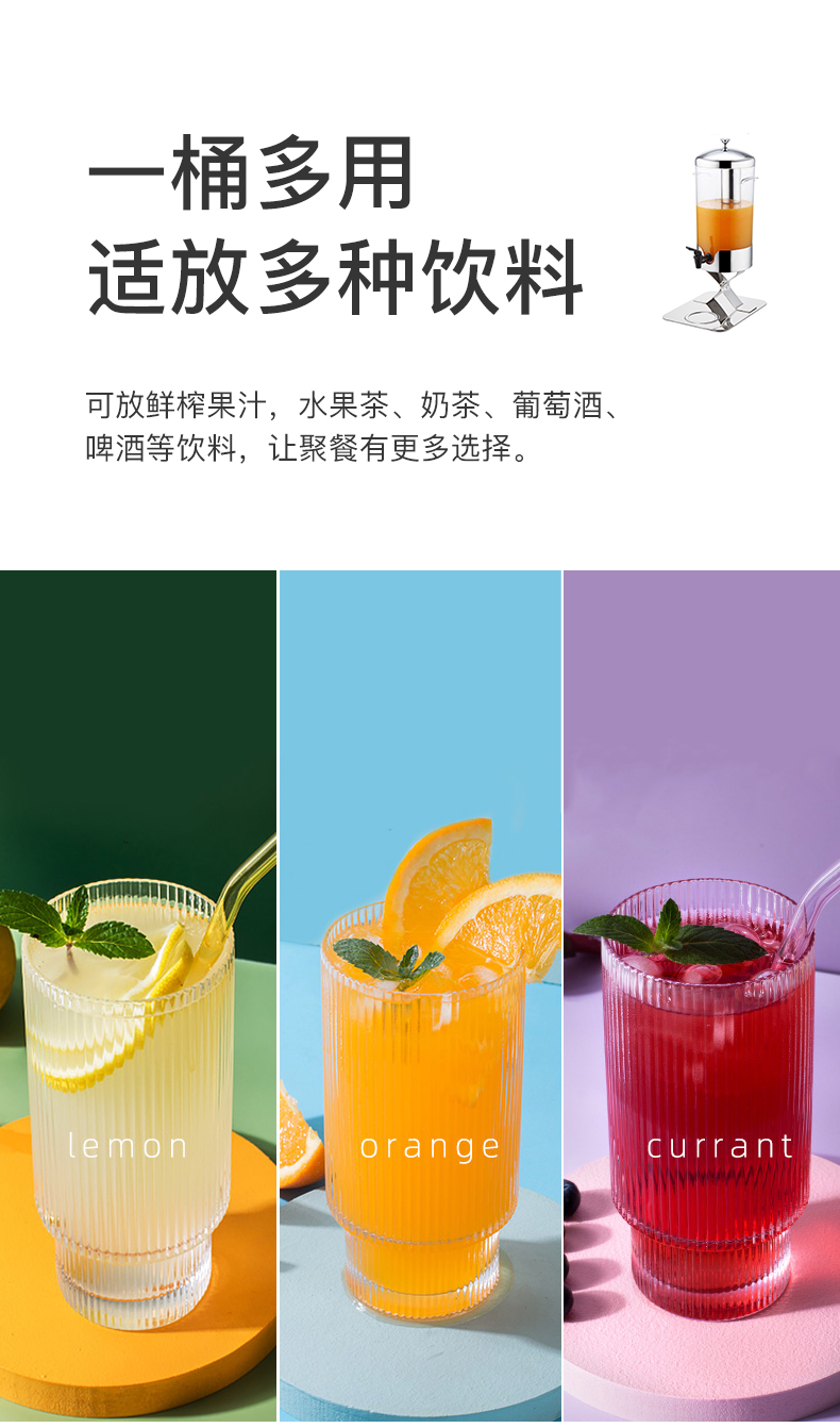 X钢座果汁鼎适合多种饮品,无论是鲜榨果汁、水果茶、奶茶,还是葡萄酒和啤酒,都能轻松应对,让自助餐饮品选择更加丰富多样,满足不同顾客的口味需求。