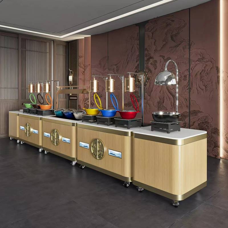 在容量和布局方面,自助餐炉需要根据餐厅的客流量和菜品的种类进行合理设计。大型宴会厅的自助餐炉通常容量较大,可容纳更多食物,以满足大量宾客的需求;而小型西餐厅的自助餐炉则相对精致小巧,适合少量多样的菜品展示。同时,合理的布局能让菜品摆放更加有序,方便用餐者取用。例如,将热菜区、汤品区和主食区进行明确划分,设置不同高度和深度的餐炉,既美观又实用。
