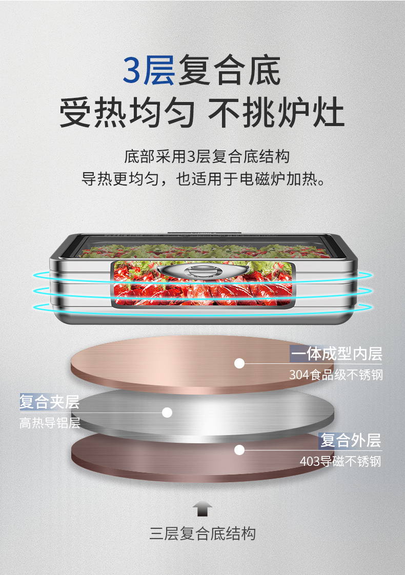 • 三层复合底设计,热能均匀分布,适配各种炉灶,确保每道菜肴均匀加热,提供精致的餐饮体验。