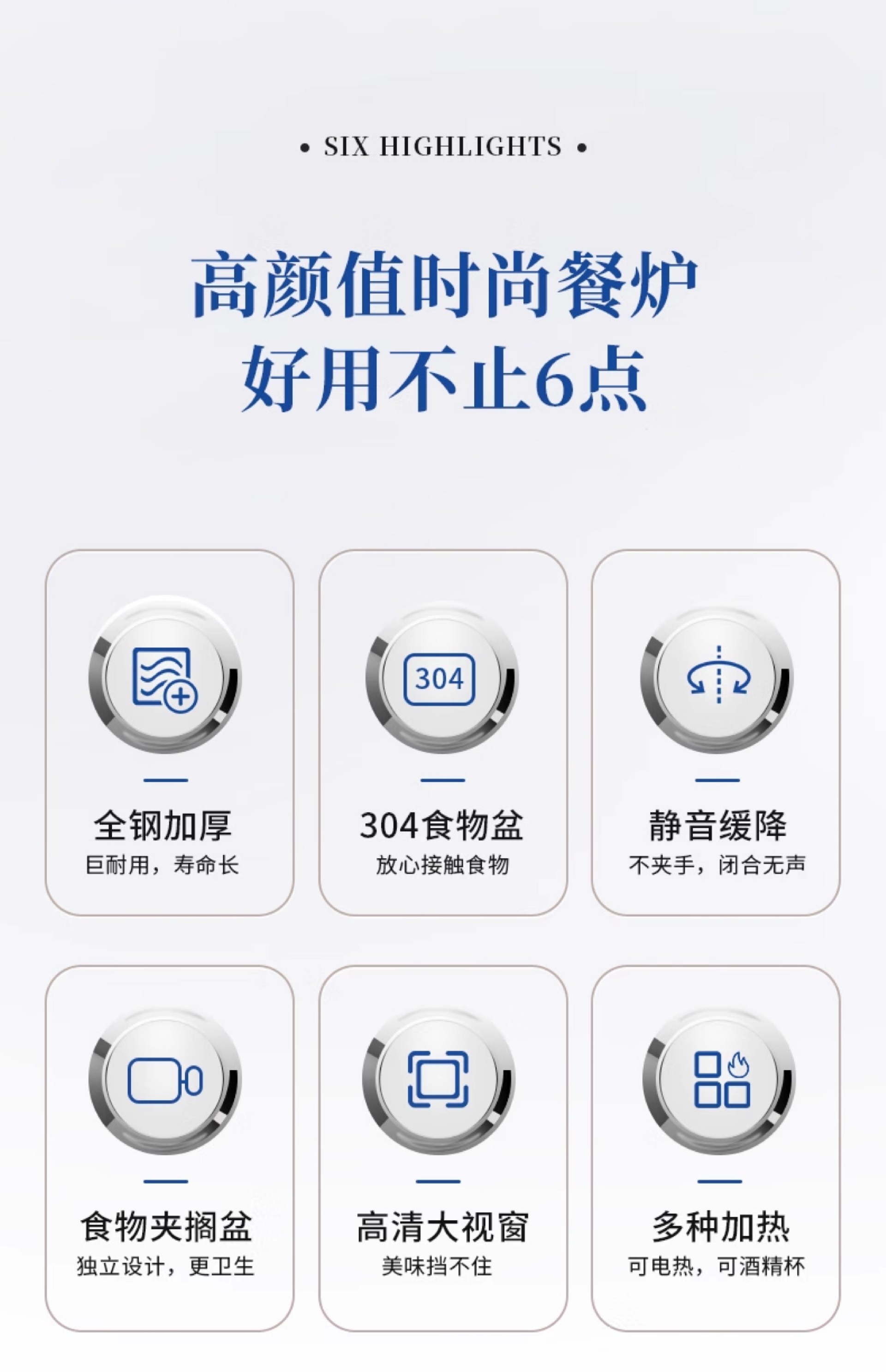 • 高清大视窗,提升用餐体验:餐炉配备高清大视窗,顾客无需开盖即可清晰看到食物,食欲大增,提升用餐体验,同时保持餐桌整洁美观。