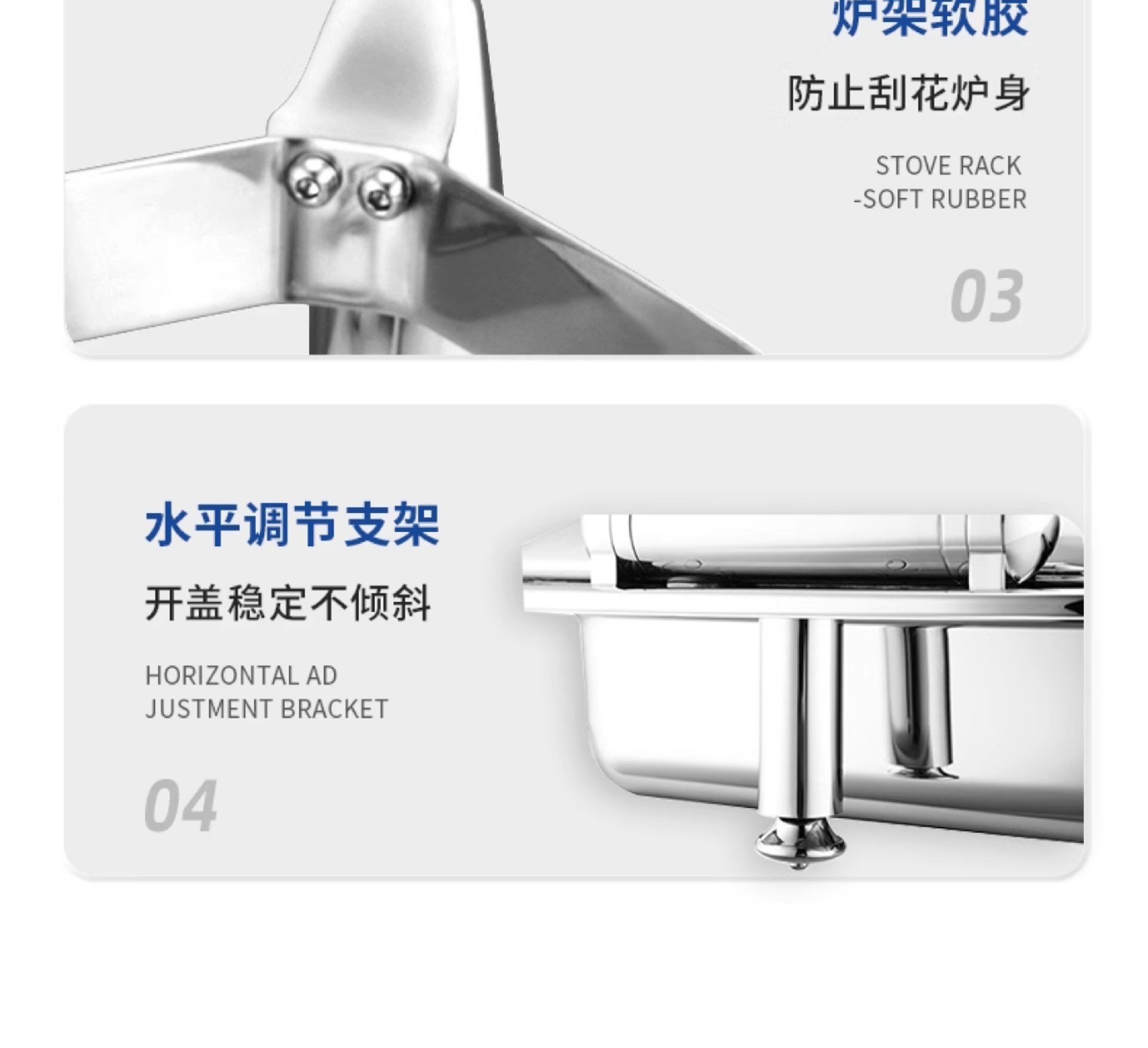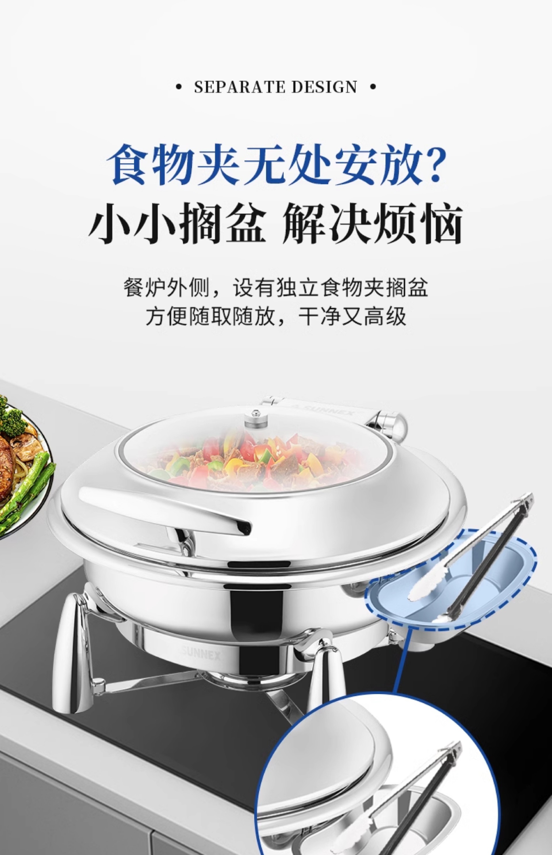 • 独立搁盆设计,卫生有保障:自助餐厅需频繁更换食物,独立食物夹搁盆设计有效避免食物交叉污染,304不锈钢材质安全接触食物,确保每一道菜品卫生放心。