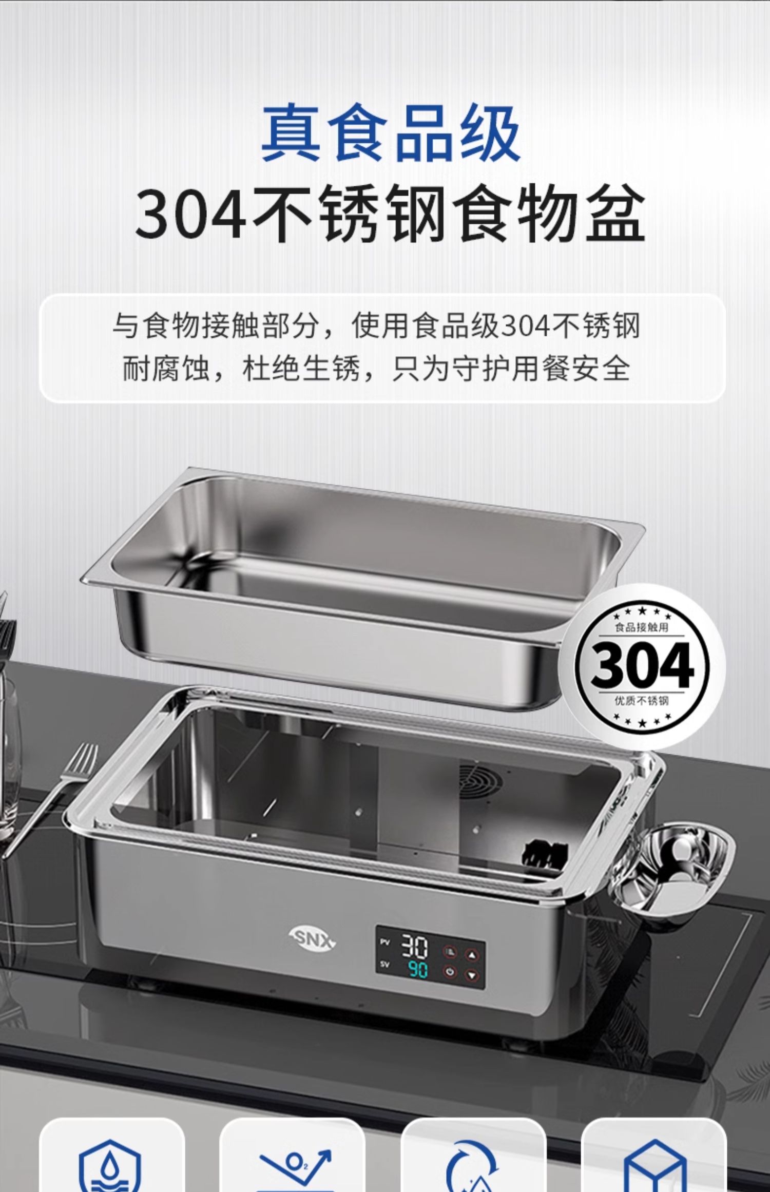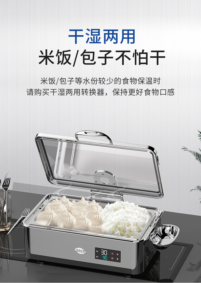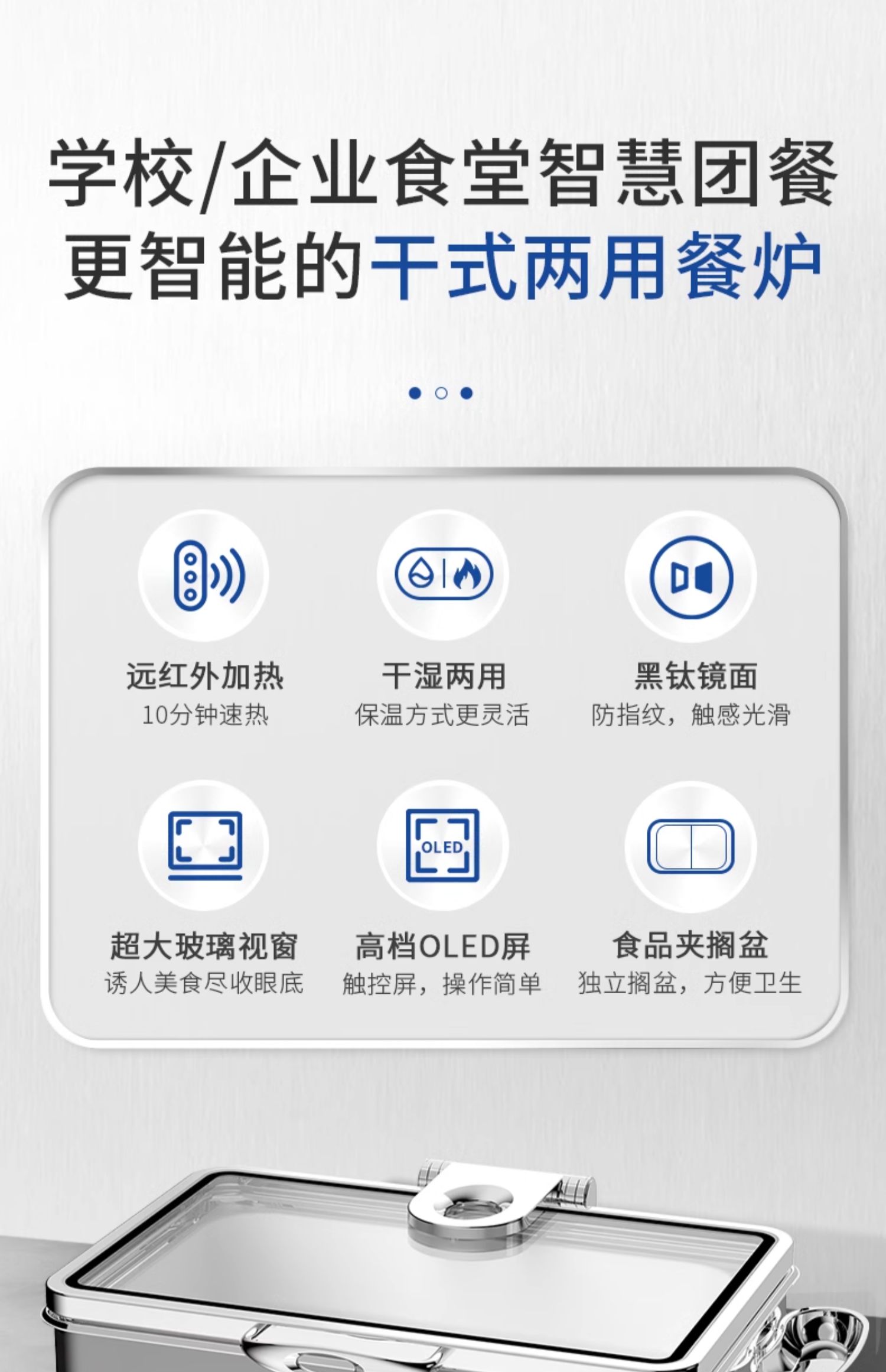 • 干湿两用,自助餐更灵活。这款餐炉支持干湿两用,提供更加灵活的加热和保温方式。无论是需要保持干燥的食品,还是需湿润的菜肴,都能通过智能调节满足不同需求,适用于多样化的智慧团餐场景,方便食堂处理各类餐品。